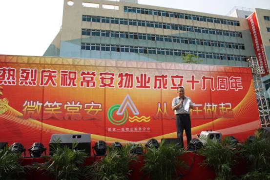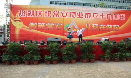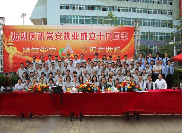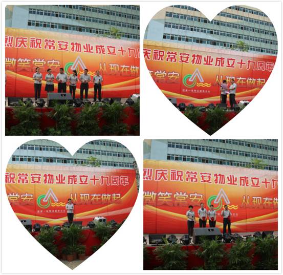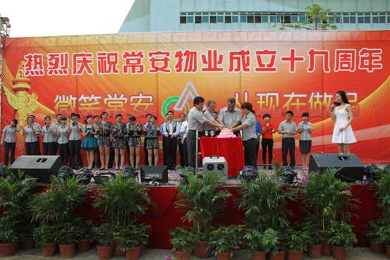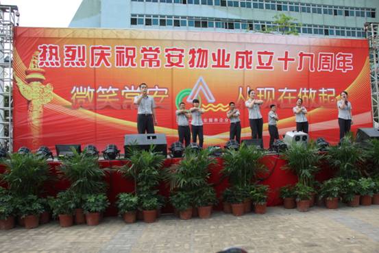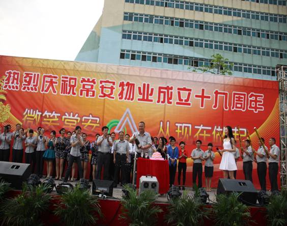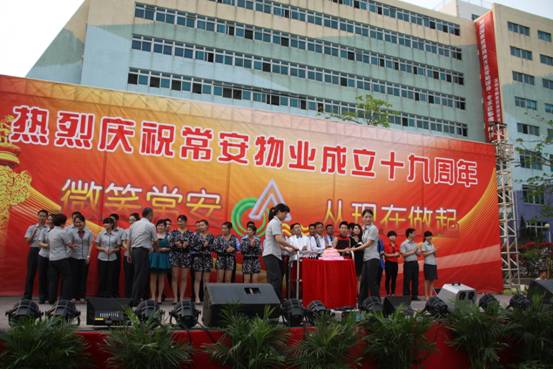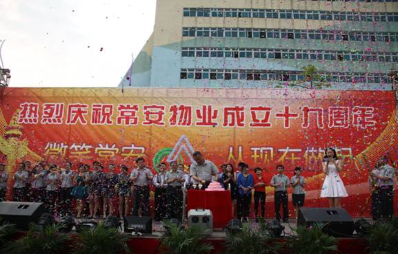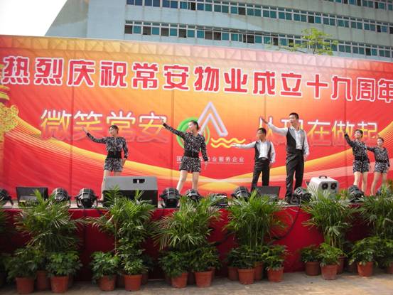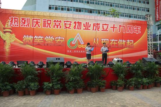 常安物業(yè)十九周年慶典于2014年4月19日下午在百旺信園區(qū)廣場成功舉辦,來自各服務(wù)中心的一百多位同事齊聚現(xiàn)場,共同慶祝常安十九周歲生日!現(xiàn)場活動十分精彩,有充滿活力的舞蹈、情感真摯的詩歌朗誦,還有優(yōu)美動聽的情歌對唱,此外還加入了以“微笑常安”為主題的征文朗誦和頒獎典禮。回顧常安十九年來的奮斗史,我們常安人榮辱與共,迎來輝煌的今天;今天我們攜手共進(jìn),展望未來,明日再攀成功的高峰。讓我們共同舉杯,祝愿我們常安的明天會更好。