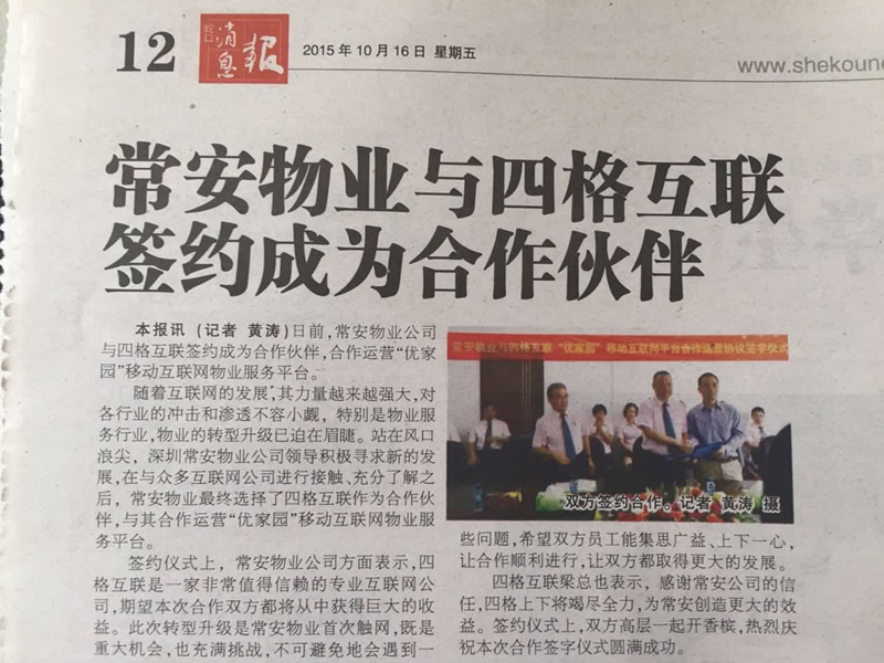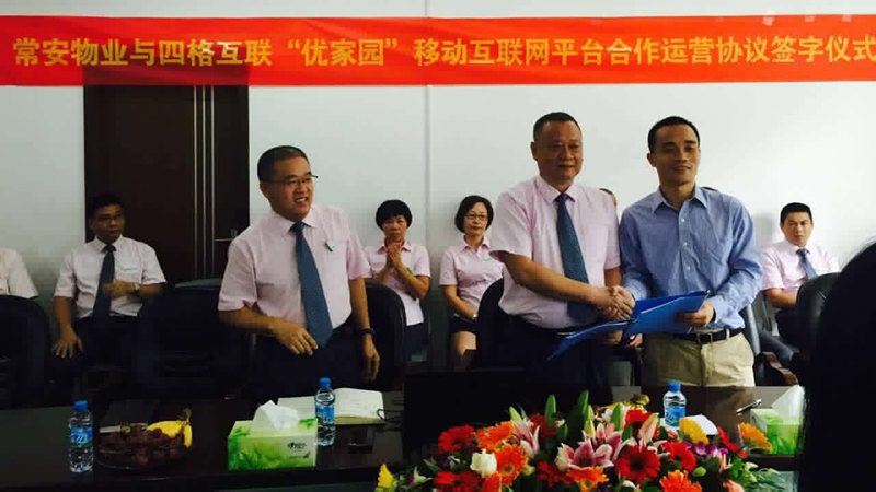 2015年10月10日上午于公司會議室與四格互聯(lián)進行了合作簽字儀式。儀式上,張武董事長表示,四格互聯(lián)是一家非常值得信賴的專業(yè)互聯(lián)網(wǎng)公司,本次合作雙方都將從合作中獲得巨大的收益。公司由于是首次進行此類轉(zhuǎn)型,將不可避免地遇到各種困難,希望雙方員工能集思廣益、上下一心,讓合作順利進行,讓雙方都取得更大的發(fā)展。四格互聯(lián)的梁總表示,感謝常安公司的信任,物業(yè)方面常安是專家,希望得到常安更多的指導,四格上下將竭盡全力,為常安創(chuàng)造更大的效益。張總和梁總簽字之后一起開香檳,熱烈慶祝本次合作簽字儀式的圓滿成功。