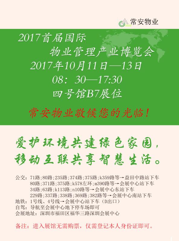 2017首屆國(guó)際物業(yè)管理產(chǎn)業(yè)博覽會(huì)于今日在深圳市會(huì)展中心舉辦,常安物業(yè)在此敬候您的光臨?。。?/span>