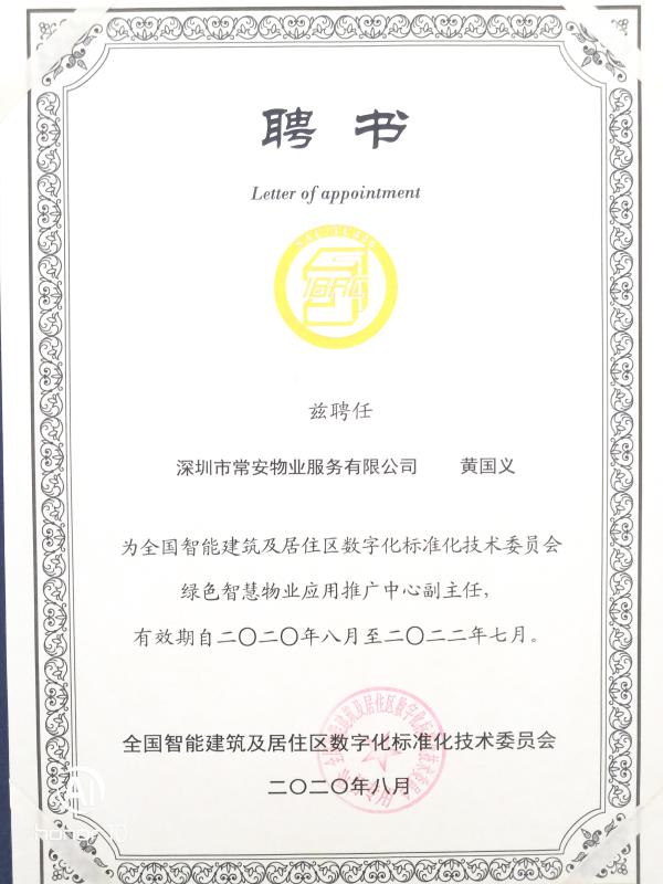 會上,常安物業(yè)公司副總經(jīng)理黃國義獲聘為全國智能建筑及居住區(qū)數(shù)字化標準化技術(shù)委員會綠色智慧物業(yè)應(yīng)用推廣中心副主任。